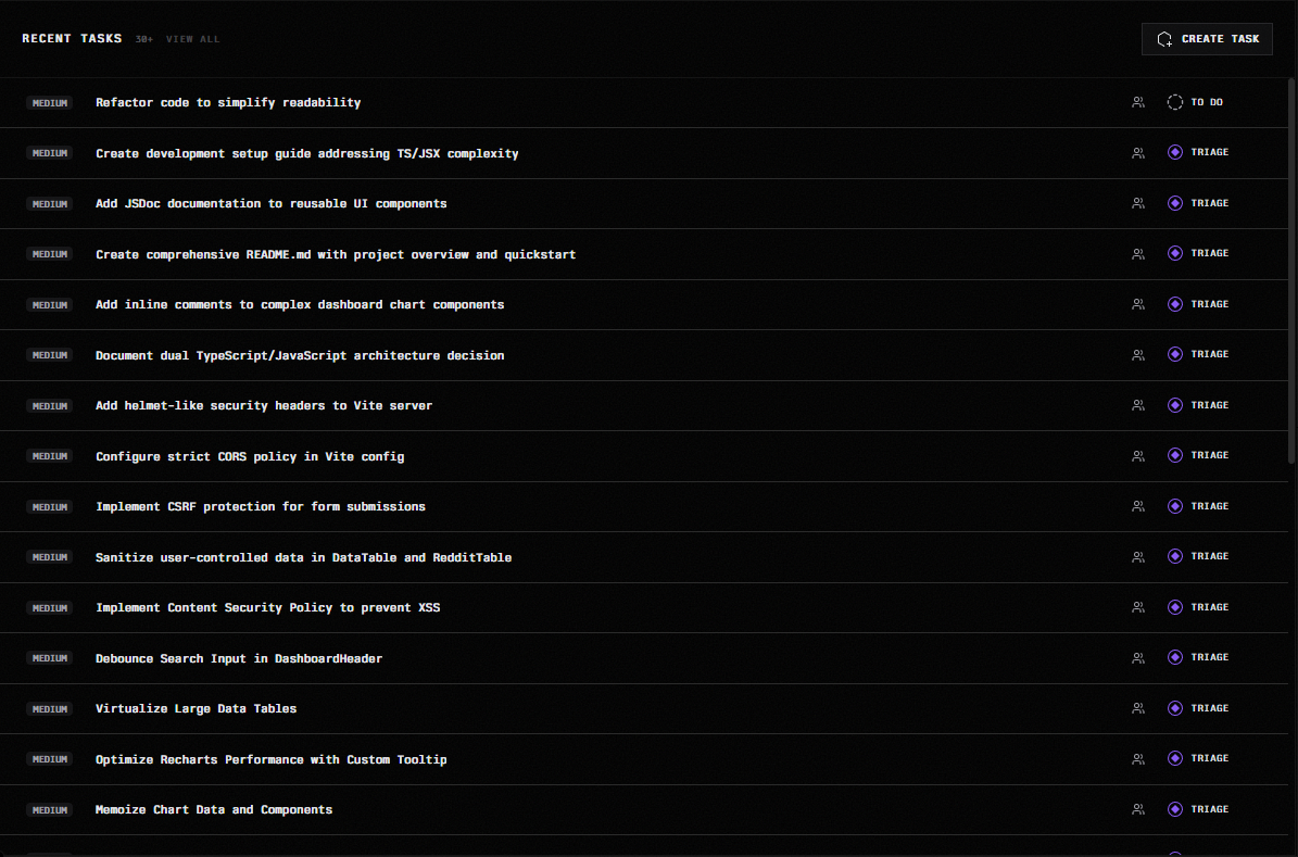 Rather than opening GitHub, a task tracker, and a separate IDE independently, the Dashboard pulls the most relevant state from all of these into one place so you can move quickly and stay in context.