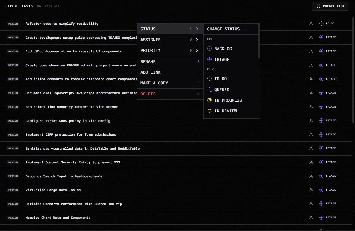 This makes it easy to triage, reassign, or reprioritize work on the fly without opening individual task views. For example, if AI Task Discovery generates a batch of new tasks all sitting in Triage, you can right-click through them one by one, set priorities, assign owners, and move them to To Do in seconds.