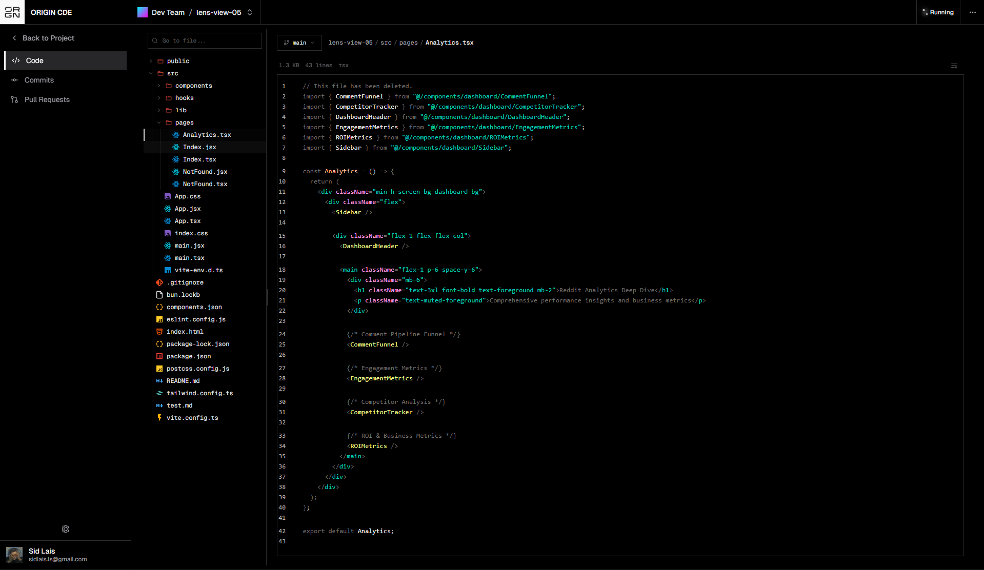 For instance, opening src/pages/Analytics.tsx shows the component structure, imports, and layout used for the analytics dashboard. You can quickly review how components such as CommentFunnel, CompetitorTracker, or EngagementMetrics are composed within the page.