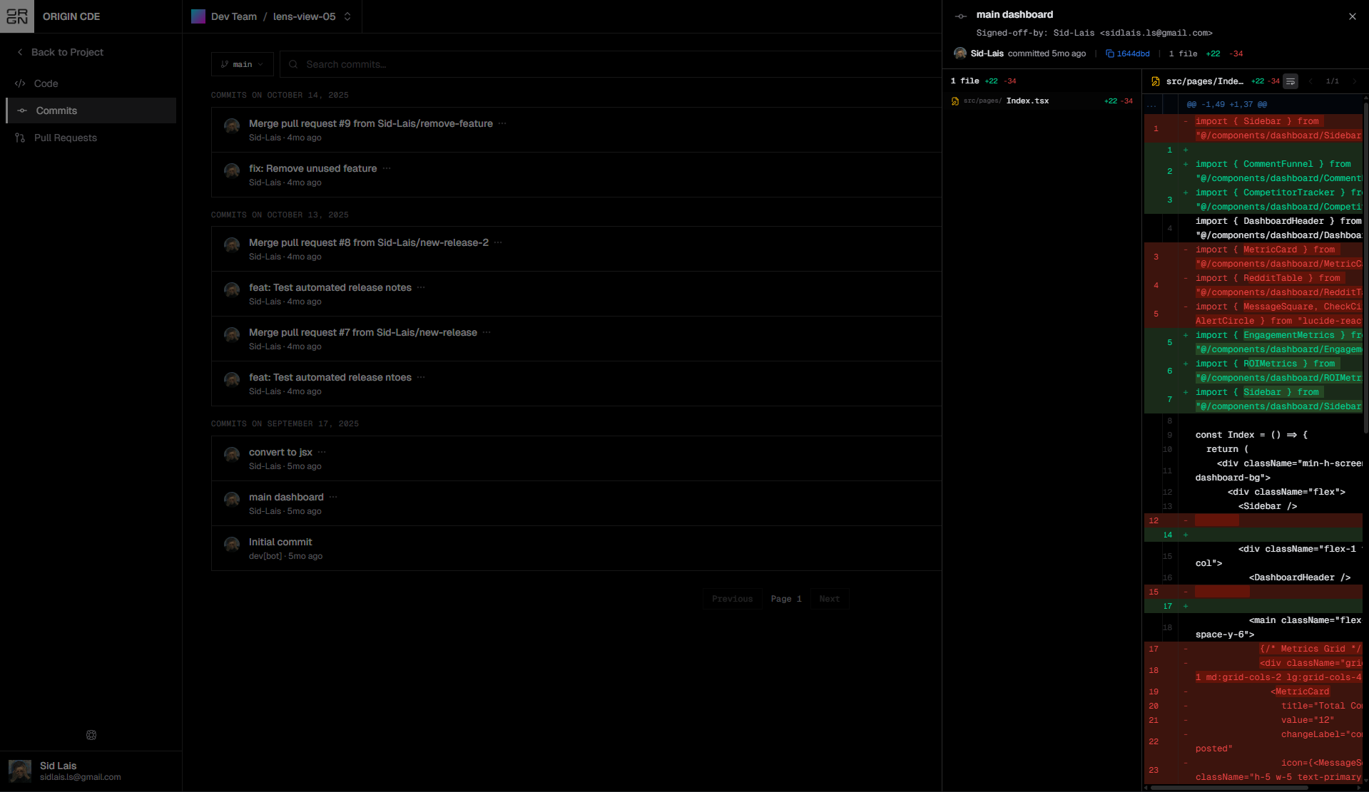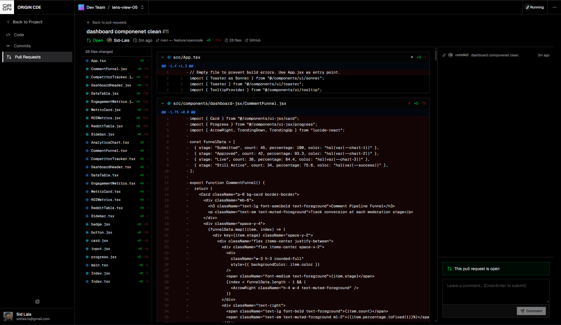 For example, a pull request such as “dashboard component clean” may include updates across multiple dashboard components. The diff viewer allows you to inspect each file and verify exactly how the implementation changed.