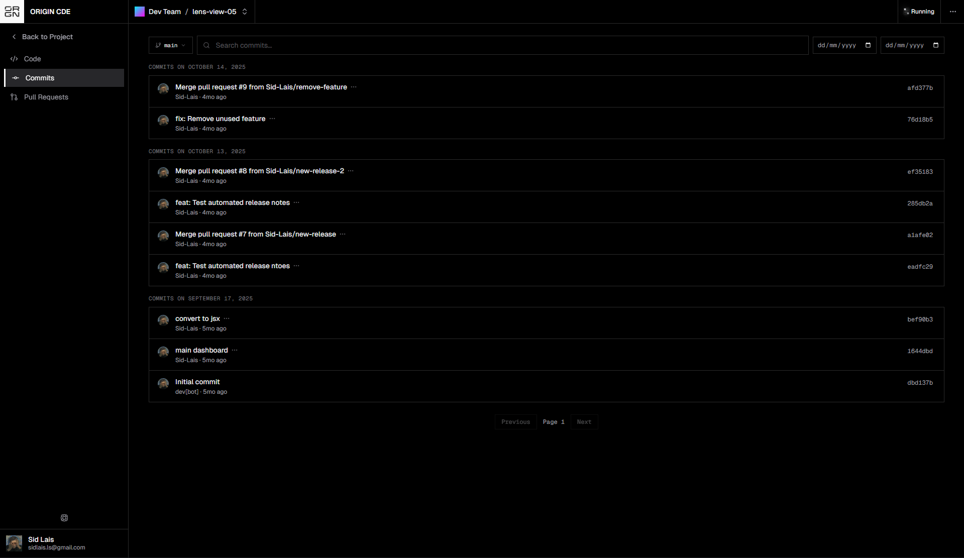- Commits – review commit history and individual changes
