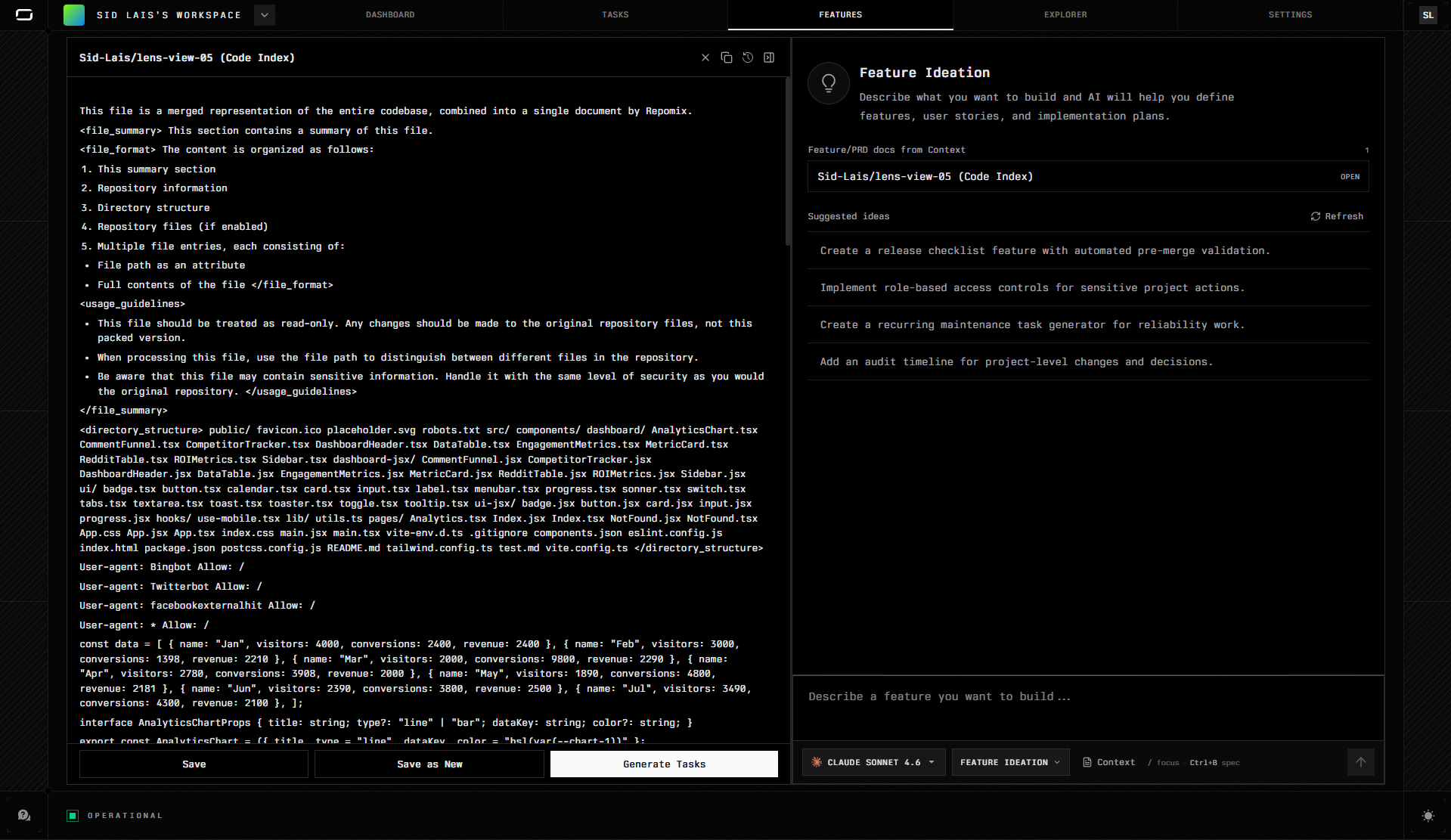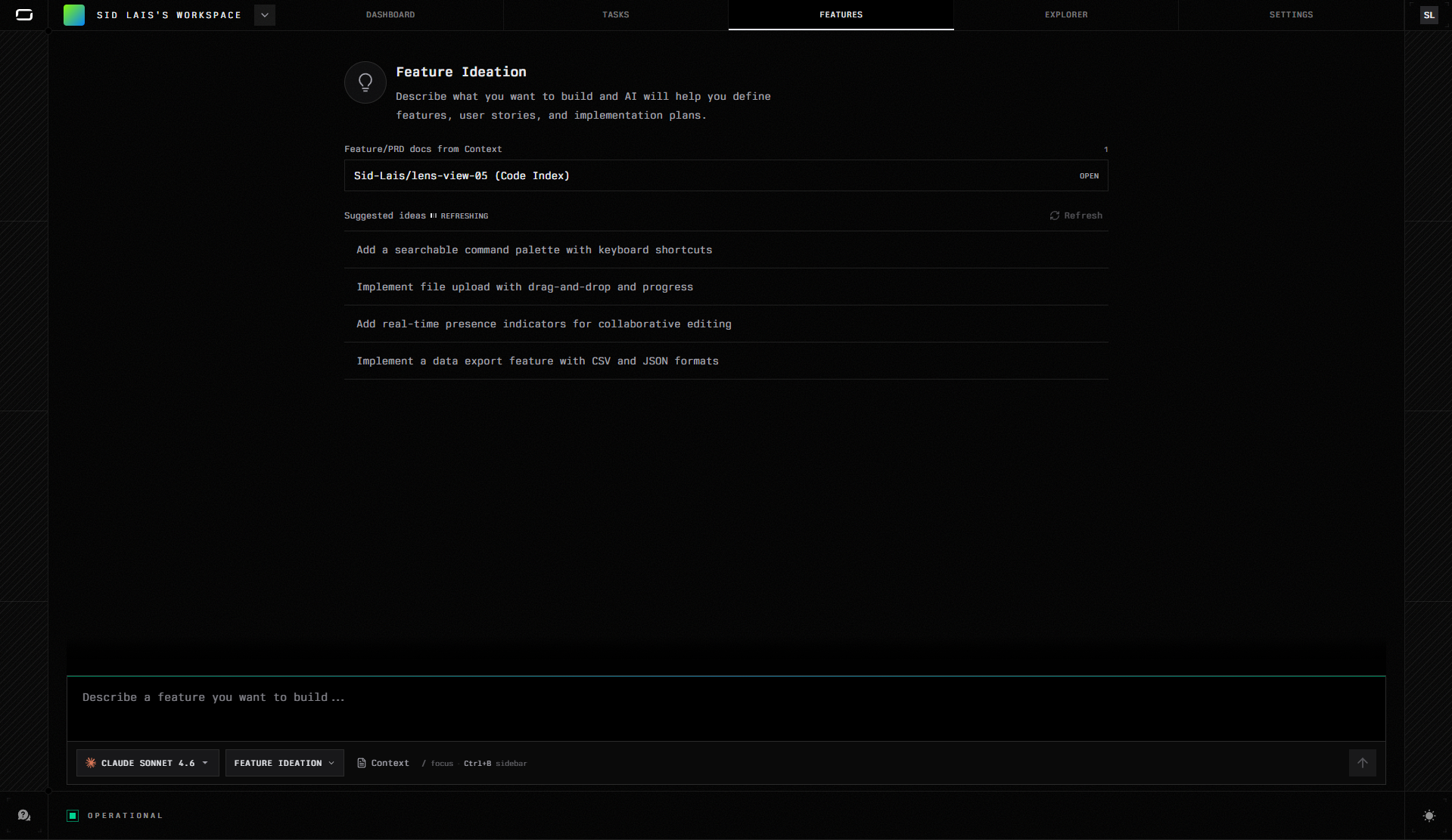 The Features workspace is designed for structured feature ideation and specification. It helps teams turn high-level ideas into clearly defined, implementation-ready artifacts before any code is written.