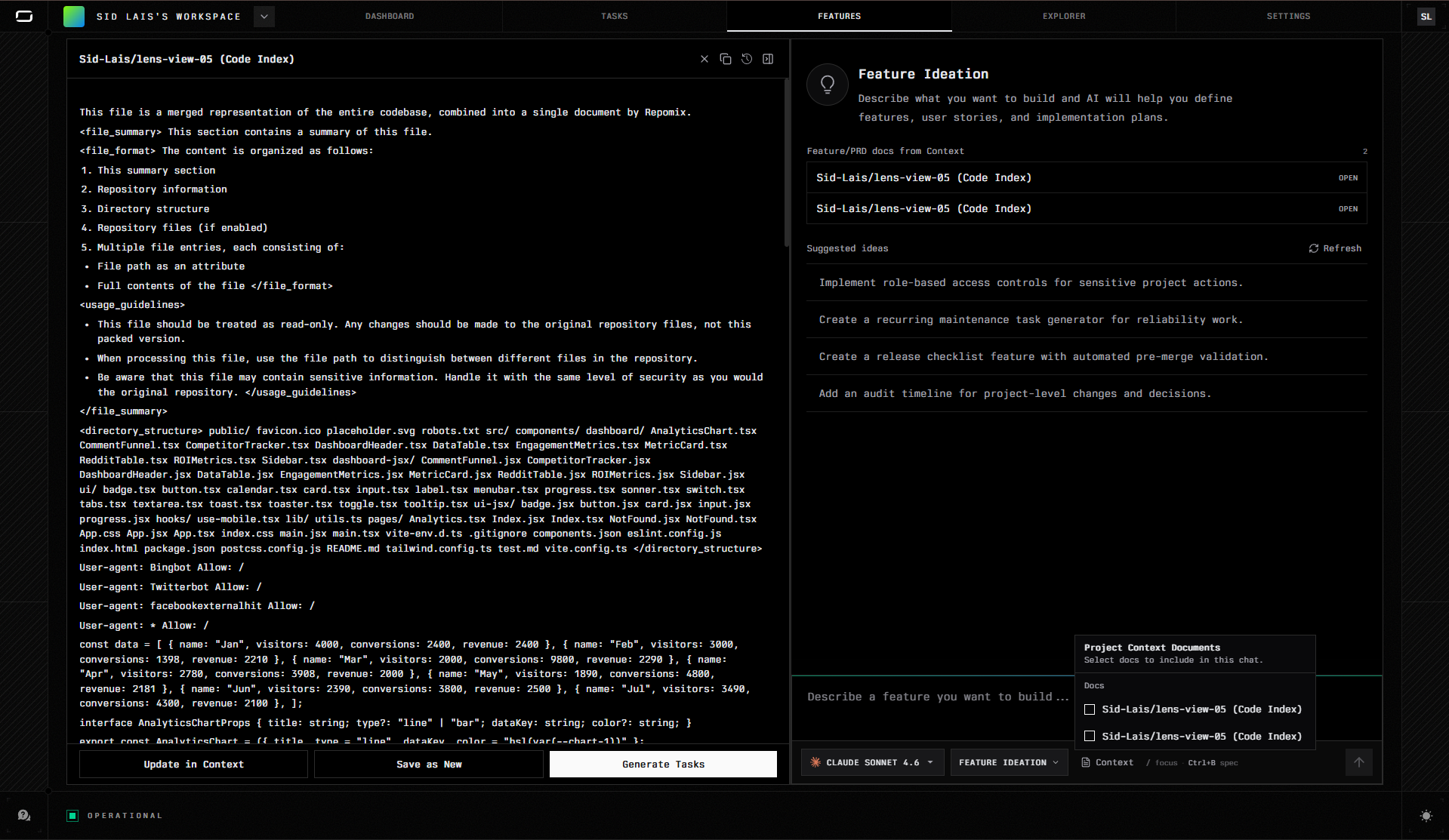 This shows all available context documents for the project. You can check or uncheck documents to control what the AI reasons over when generating feature specifications. Including the code index gives the AI awareness of your existing architecture, which leads to more relevant and grounded output.