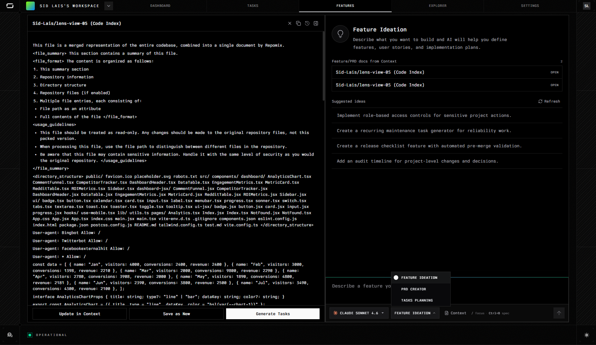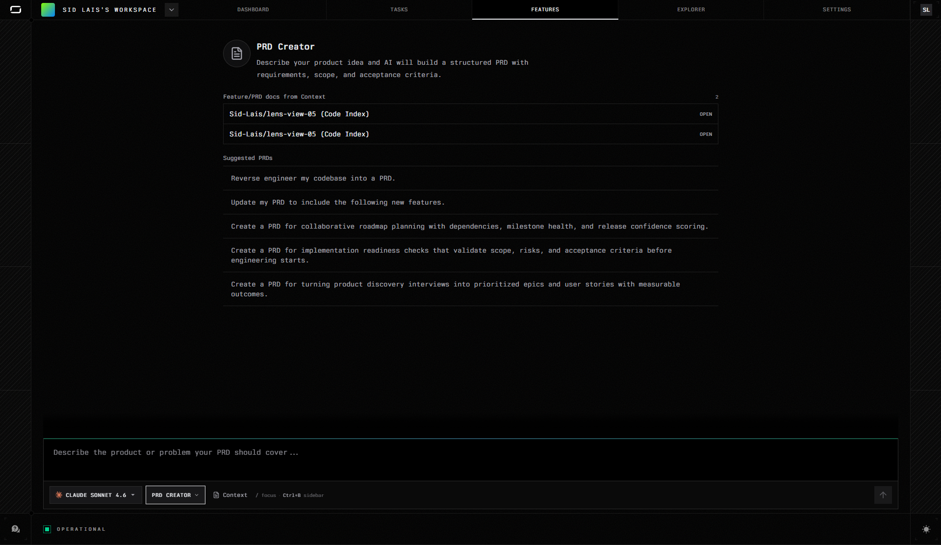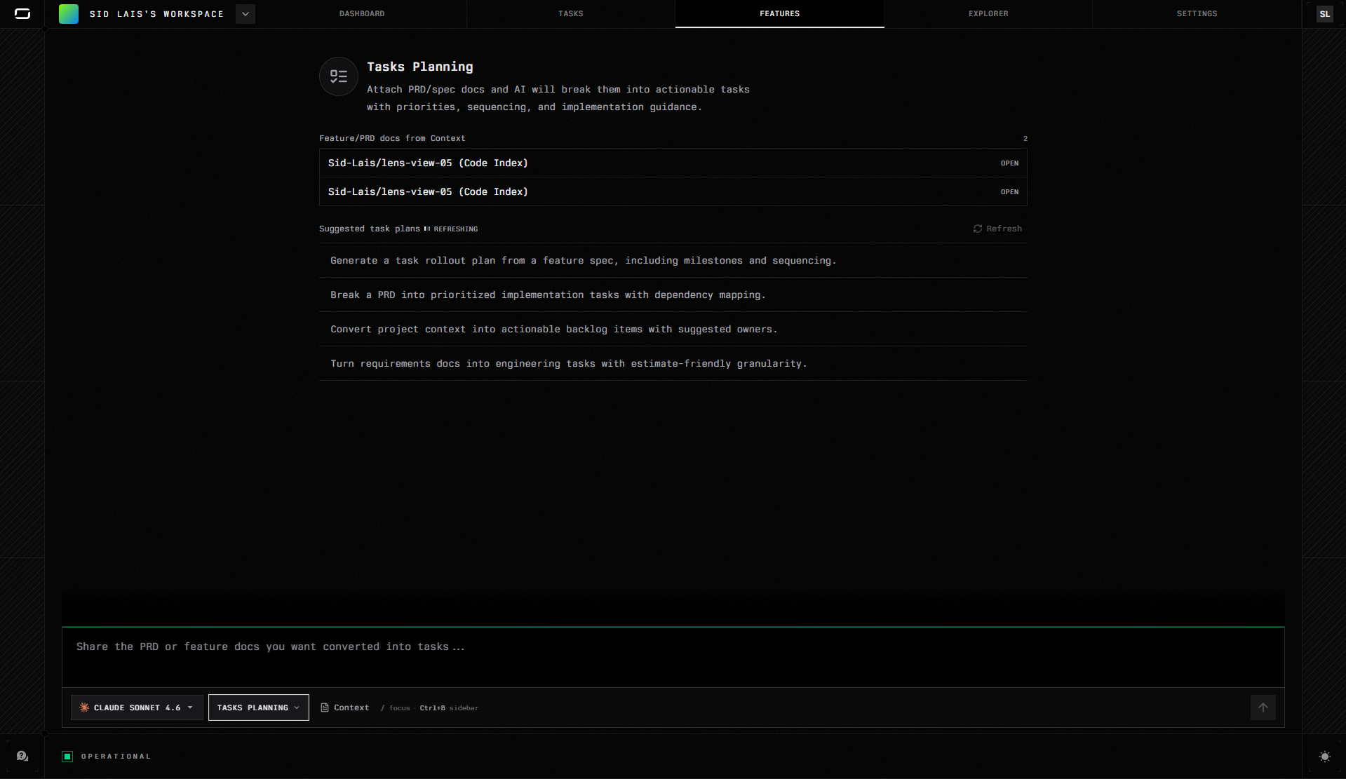 At the bottom, a text input lets you describe the feature you want to build in natural language. The model selector shows which model is active (e.g., Claude Sonnet 4.6), and the mode selector lets you switch between Feature Ideation, PRD Creator, and Tasks Planning depending on what kind of output you need.