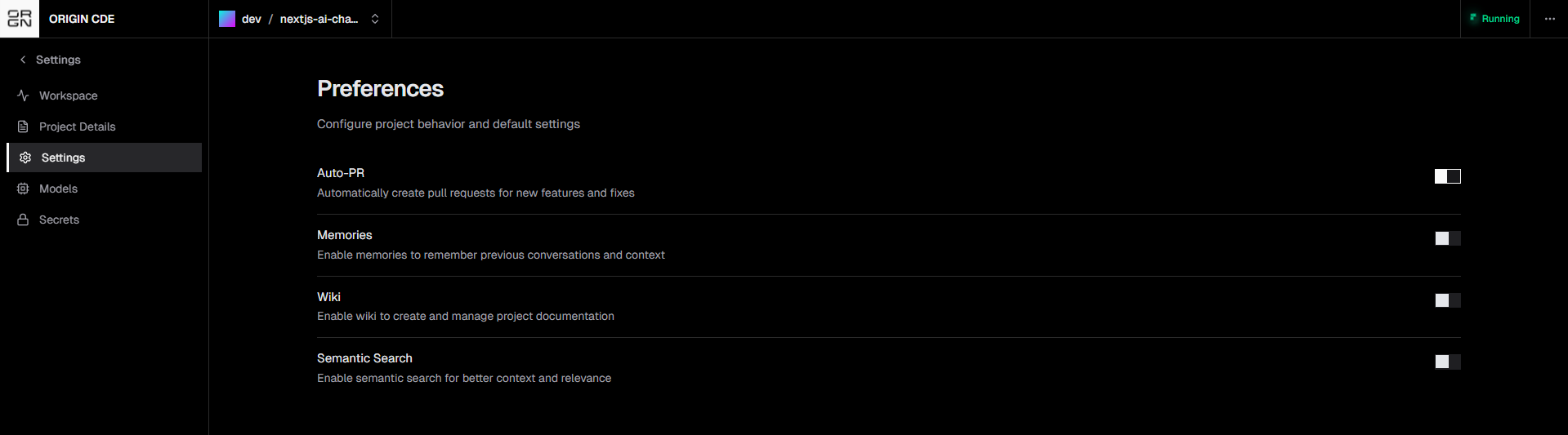 Once a project is actively used inside Origin, teams need control over how agents execute work, not just what they can access. The Settings tab defines these execution-level behaviors. It governs the degree of autonomy agents are granted, how changes flow into review workflows, and how context is retained across sessions.